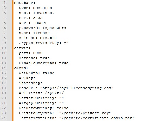 2.Update the configuration file (default.yaml) the FreeFlyer licensing team sent to point to your Private Key (private.key) and Certificate Chain file (certification-chain.pem).