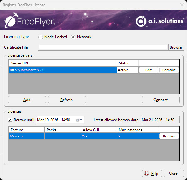 Borrowing the license (i.e. checking the "Borrow Until" option when connected to the server) will allow you to borrow a FreeFlyer license from the server until a specified date and time. Standard licenses can only be borrowed for up to 3 days. This license will allow you to use FreeFlyer without an active connection to the license server until it is returned or the borrow end date is reached.