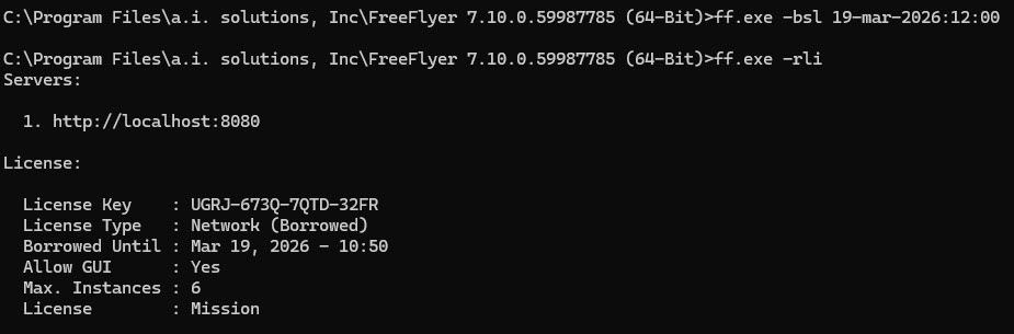 To borrow a server license in Windows using FF.exe, open a Command Prompt window, navigate to the FreeFlyer install directory, and use the borrow server license switch (-bsl). Once you've borrowed the license, you can use the report license information switch (-rli) to view the start and end times for the borrowing period.