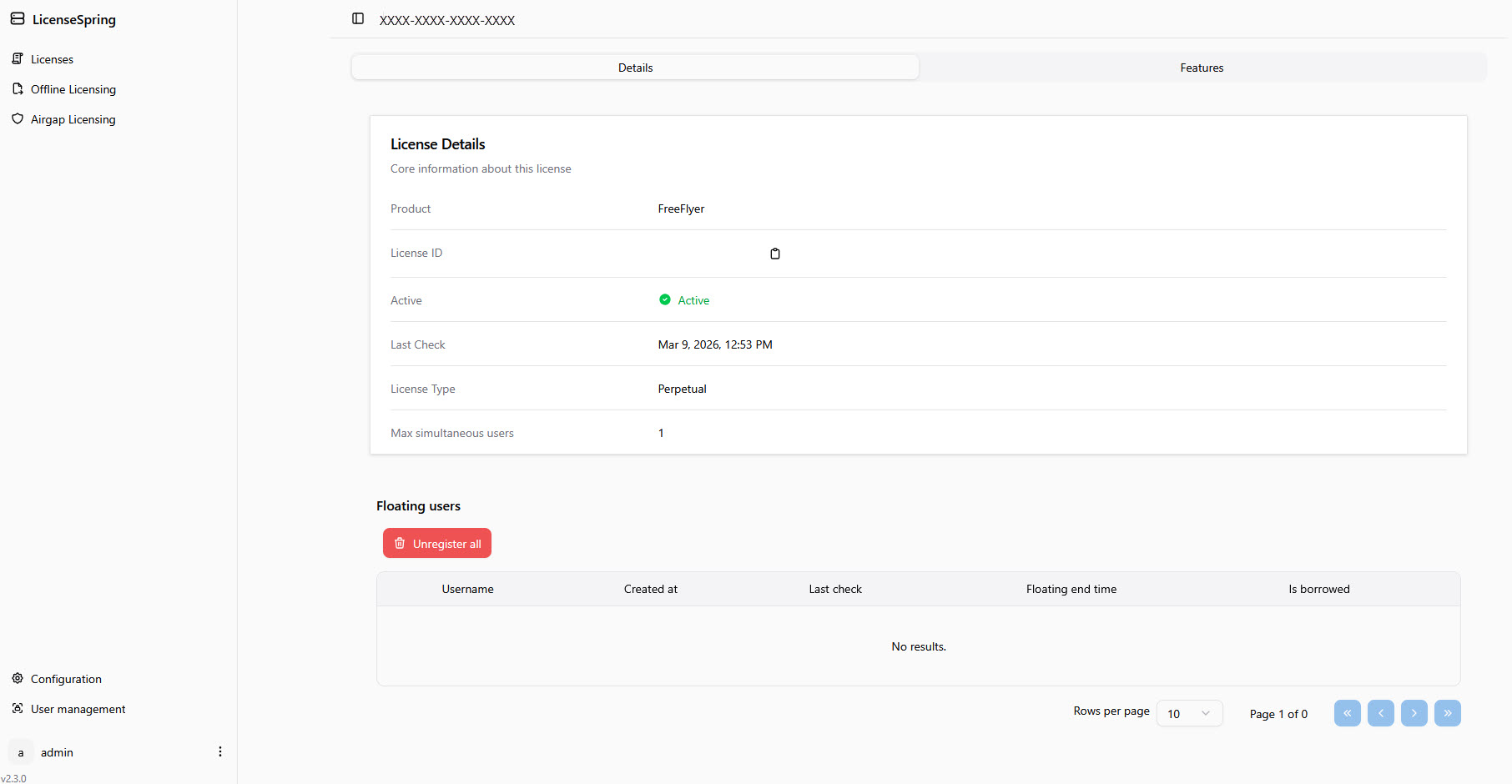 As an administrator, you can see which users are currently using the license and what features are available by clicking on the license key from the Licenses page.