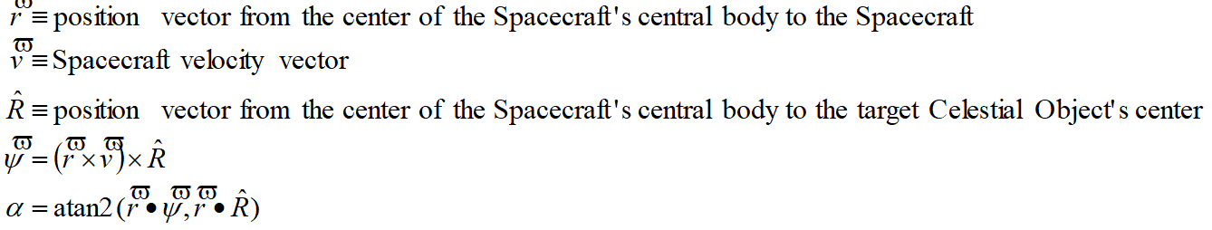 DescriptionReturns the times when the Spacecraft is at each of the cardinal points. The cardinal point calculations are based on the alpha angle, which is the angle between the Spacecraft's position and the target CelestialObjects's position with respect to the Spacecraft's central body when both vectors are projected onto the Spacecraft's orbit plane. Note that the target CelestialObject is modeled as a point.